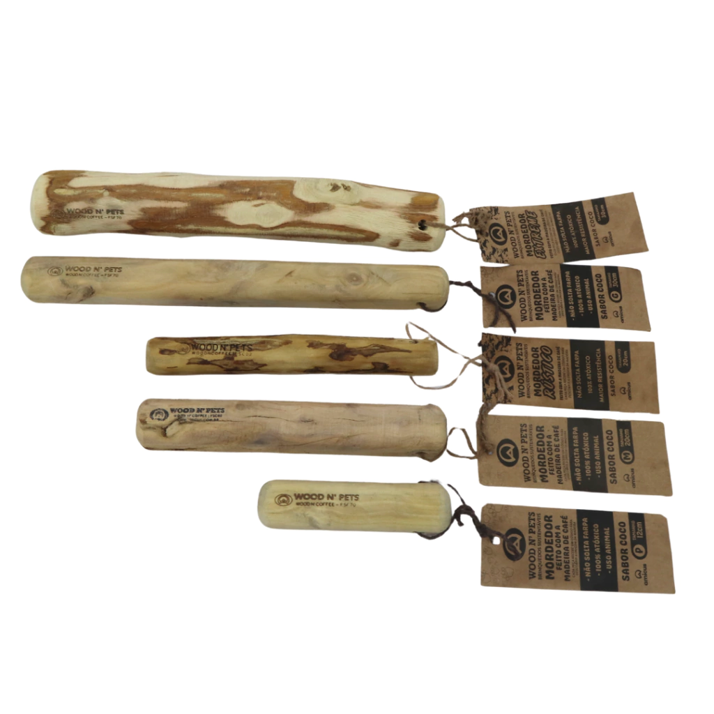 A madeira do café é ideal, pois é fibrosa não soltando farpas e as fibras são celulose que ajudam na digestão do cão e limpeza dos dentes. O WOOD N PETS STICK é ideal para brincar com seu cão, saciando sua vontade de roer.